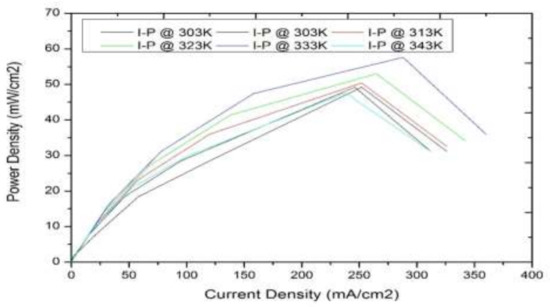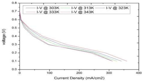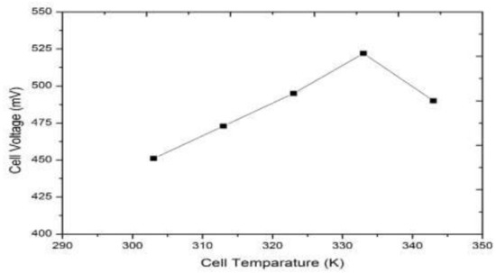 Experimentation of the squoval-shaped manifold holedesign(SSMHD)-based DMFC was carried out with a Pt-Ru/C catalyst combination in order to determine the optimum operating temperature (TCell) of the DMFC with a methanol concentration of 1 M and a methanol flow rate of 1 mL/min. The output voltage of DMFC for a defined current was measured using an electronic load bank and the performance of DMFC was analyzed. Voltage and power density obtained during the run of the experiment against current density were plotted (I–V Curve and I–P Curve) and are shown in Figure 9 and Figure 10, respectively.