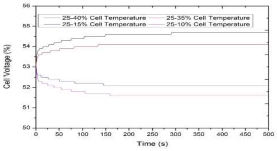 Step response analysis was carried out in simulation to validate the developed mathematical model and its behavior. Step input changes were given at the operating temperatures of 313 K, 323 K, and 333 K (25%, 50%, 75% of the cell temperature) with ± 10% and ± 15%. Step response of the system at 25% of the cell temperature for a step change of ± 10%, and a step change of ± 15% of cell temperature were observed and are given in Figure 6. Similar runswere conducted at 50% of the cell temperature and 75% of cell temperature and are recorded in Figure 7 and Figure 8, respectively. From the step response curves, it was concluded that the developed model was behaving linearly in these operating temperatures.