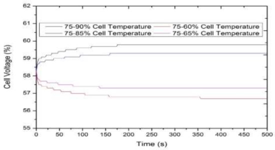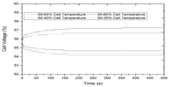 It was also observed from Figure 3 and Figure 4 that the DMFC output voltage increased the methanol flow rate by up to 1 CCM and increased the 1M methanol concentration, thereafter, (i.e., greater than 1CCM methanol flow rate and higher than 1M methanol concentration) DMFC output voltage did not vary significantly and remained constant due to the methanol crossover to cathode. It was also observed from Figure 5 that the output voltage of the DMFC increased linearly with an increase in temperature up to 333 K and decreased beyond that due to the dry-out effect in the cell. From the dynamic studies, it is clear that the temperature is the most influencing variable on the output voltage of DMFC. Hence, this working temperature was selected as a manipulated variable for further investigation.