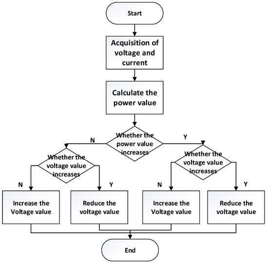 Among MPPT algorithms, the most widely used algorithm in engineering today is the Perturb and Observe algorithms (), which is also one of the earliest algorithms. Its advantages are simple and efficient under non-complex lighting conditions, low cost, and convenient detection and calculation. The so-called disturbance is to increase or decrease a voltage increment U from the original detected voltage. Then, the principle of is to obtain the current and voltage values at the current time through the current and voltage detection elements, calculate the power value at the current time, and then add a perturbation to the original voltage. If it is large, then continues to increase the perturbation comparison, otherwise it reduces one perturbation. In short, the direction of the disturbance is consistent with the direction of power increase. The flowchart is shown in Figure 3.