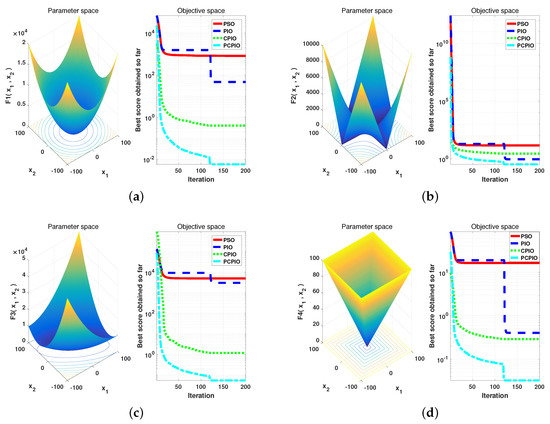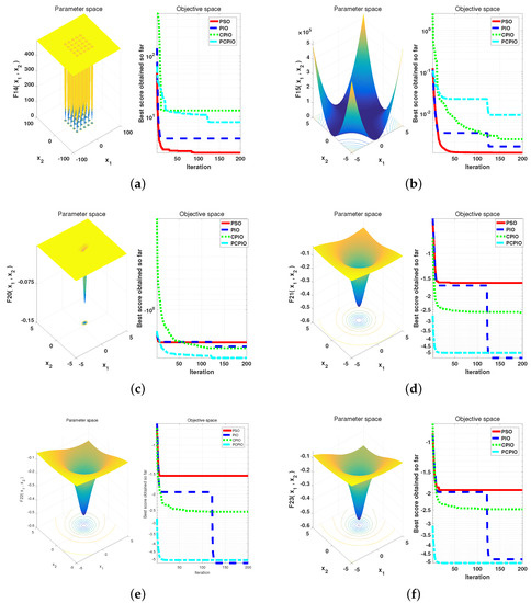 To evaluate the performance of the PCPIO algorithm proposed in this paper, the test function in [19,37] was used as the criterion. Detailed information about the function is given in Table 1, Table 2 and Table 3, where represents the theoretical minimum of the test function. PCPIO, PIO, PSO, and CPIO were compared. Table 4 gives detailed experimental results. The number of iterations of PIO and its improved algorithm were 120 times in the first stage, 80 times in the second stage, and 200 times of PSO operation.