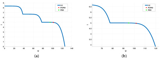 As a new type of bionic evolutionary algorithm, the working process of the PIO algorithm is to iteratively update the parameters and finally approach the optimal solution. In addition, while the PIO algorithm optimizes global parameters, it can also identify each pigeon as a solution to solve the optimization and search problems. The solution to this problem is the result of elimination after each pigeon evolved and compared. Under complex lighting conditions, the PU characteristic curve of the photovoltaic array becomes a multi-peak state. The traditional single-dimensional algorithm cannot distinguish the difference between the extreme values, which may lead to local optimization and cause power loss. Figure 7 and Figure 8 show the characteristics of P–V and I–V with cover and MPP optimization using PSO and PCPIO. The results show that PCPIO is better than PSO to find the maximum power point that PCPIO and PSO can reach with cover. The basic principle of PCPIO-based MPPT can be explained as: during the iterative operation of the objective function, each pigeon records its own speed and compares with its previous position, and finds the closest position to the MPP, which is the optimal value of the group of pigeons . After the elimination and evolution of the particles, when reaches the MPP, the function iteration terminates.