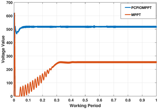 MPPT was performed on photovoltaic arrays using ordinary perturbation observation methods. The array was composed of three above-mentioned modules in series. The three photovoltaic modules had a temperature of 25 C and a light intensity of 1000, 800, and 600 W/m. The simulation model uses an algorithm that directly perturbs the duty cycle. As can be seen in Figure 11, the power of the pure MPPT algorithm is finally stable at about W, while the hybrid algorithm of PCPIO and MPPT is stable at about W. Although the traditional variable-step-disturbance observation method is fast and stable, it does not have the ability of global optimization, and the PCPIO algorithm can make up for the above shortcomings.