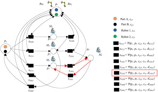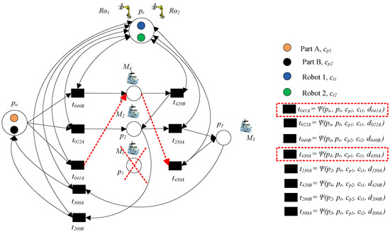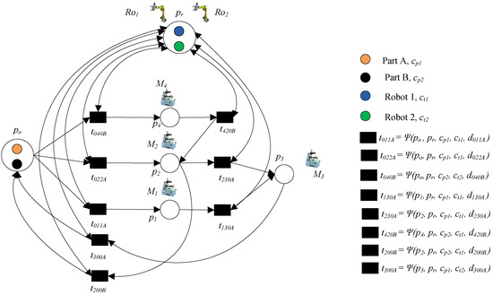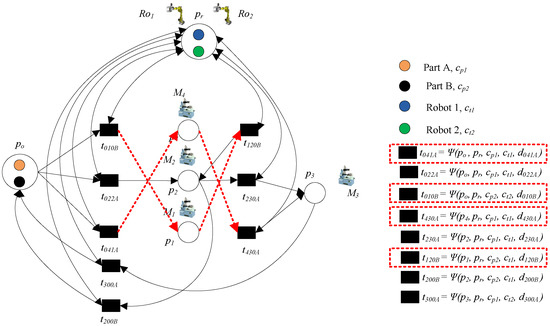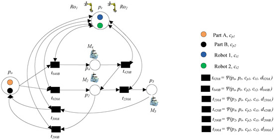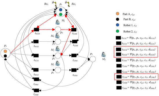 - Step 2: Add the transportation operation of part B. Transitions t041B and t052B denote loading part B to p4 and p5, respectively, where Ro2 is needed; t420B and t520B denote transporting part B to p2, where Ro1 is needed; these operations can be done by common place pr.
