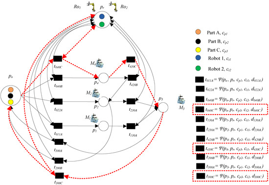 - Step 2: Add the transportation operation of part C. Transition t040C denotes loading part C to p4, and Ro2 is needed; t430C denotes transporting part C to p3 and Ro1 is needed. Transition t300C denotes unloading part C from p3 and Ro2 is needed. These operations can be done by common place pr.
