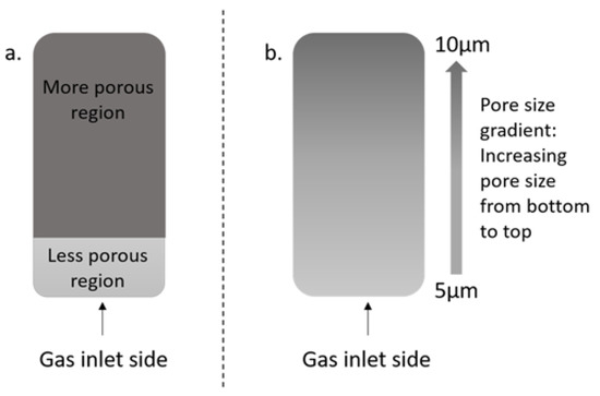 (a) Schematic representation of different porosity regions in PTL as studied in [33]. (b) Pore size gradient within PTL as in the study from [39].
