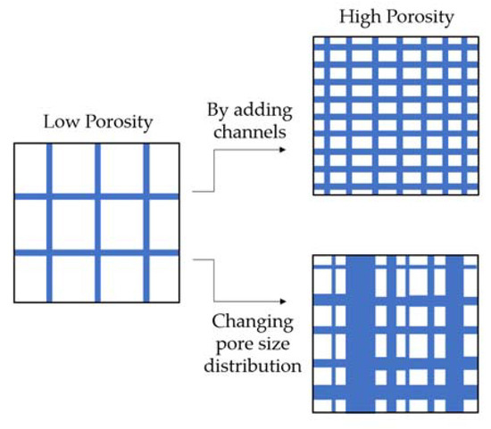 In such networks, the porosity can be increased basically in two ways, namely by (i) increasing the number of throats of the same dimensions, and (ii) changing the distribution of the throat sizes (Figure 2). In the example illustrated in Figure 3, porosity and mean throat diameter are kept constant and only the distribution varies following the invasion pressure curve computed using Equation (1). As can be seen, the differences in the structural organization of the PN are expected to result in different overall liquid saturations and different gas–liquid distributions [53]. The larger pores and throats are invaded by the gas phase while the smaller ones remain liquid saturated.