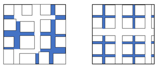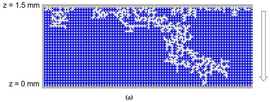 Ref. [58] considering the PSD with mean throat radius and standard deviation . (In Equation (3), Lt denotes the length of a throat). The conditions for capillary fingering are fulfilled, if the capillary number is below 10−4 [48,59]. With the given values for viscosity, surface tension and PSD, this would be achieved if the invasion velocity is below 3.3 mm/min (with liquid viscosity of water η = 10−3 Pa s and surface tension σ = 0.073 N/m at 20 °C, throat length Lt = 50 µm and standard deviation = 1.5 µm). This is in good agreement with correlations of the invasion time and current density estimated in [46]. Transition to another invasion regime, e.g., stable displacement or viscous fingering [48] would occur if the invasion velocity would be increased or also if the standard deviation of the throat size would be decreased. Such effects are observed in the research of drying of PNs, where sufficiently narrow PSDs can result in stable, i.e., viscosity-dominated invasion [58]. When viscosity comes into play, the width of the invasion front scales with capillary number. However, in the absence of viscosity, the probability of the throat invasion depends on the PSD. In the limit of identical throat sizes, all throats would be equally selected for invasion. In the case of our simulation, where in a such a limit the selection would not be stochastically distributed but ordered by the throat number, the invasion would always occur in the throat with the lowest number (also refer to Figure 4) wherefore consequently this special situation (i.e., no distribution of throat and pore sizes) could not be simulated with the current algorithm. In contrast, when the throat size distribution becomes broader, the invasion follows the path of the least resistance, which results in a more random distribution of the phase patterns, provided that the throat sizes are randomly distributed. Following [60] and [61], the occupation probability decreases with growing ∆r.