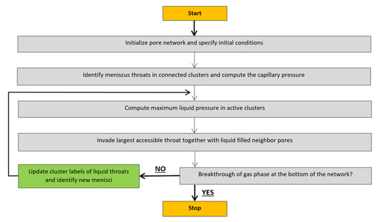 During this process, labeling of liquid clusters is used to identify the pores and throats that are connected to each other and form a pathway for liquid and gas transport. At the start of the invasion process, the network is completely occupied by liquid, and there is only one cluster spanning the whole network and conducting the liquid phase. With initiation of invasion, numerous liquid clusters can form that are distinguished into liquid-conducting clusters (connected to bottom and top side of the PN) and isolated clusters. The Hoshen–Kopelman algorithm [54,55] is used for the labeling of these clusters. Clusters are reviewed and relabeled after each invasion step to update the connections between the pores and throats.