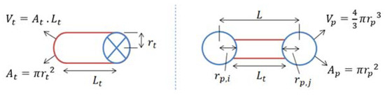 Pore and throat radii () are randomly distributed around a given average value with defined standard deviations. The geometrical arrangement of throats and neighbor pores with the relevant geometry parameters is illustrated in Figure 6.