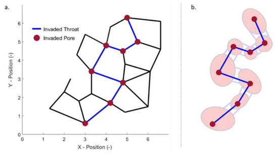 After the geometric parameters are specified, active, i.e., invading clusters with their menisci are identified and the maximum liquid pressure is computed within the active clusters using Equation (1). The algorithm then selects the largest accessible throat or pore for gas invasion following the rules specified in Vorhauer et al. [46]. As invasion proceeds, entrapped clusters are formed, which are permanently isolated due to the incompressibility of the fluids.