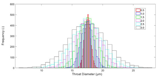 Histograms of pore size distribution (PSD) with varying standard deviation in µm as indicated in the legend.