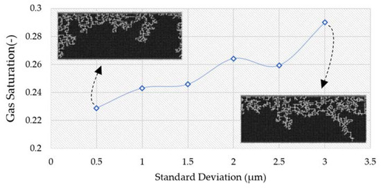 The standard deviation values were varied from 0.5 µm to 3 µm for a mean throat size of 17 µm (Figure 9), and pore sizes were used with a constant standard deviation value of 2 µm. Monte Carlo simulations were done for each data point so that the given gas saturation values in Figure 10 and Table 3 are an average of 20 simulations. In general, it is observed that the final gas saturation increases at breakthrough with widening of the radius distribution.