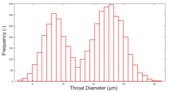 Bimodal throat size distribution with standard deviation 2.0 µm for smaller (the first peak) and 2.5 µm for larger (the second peak) throats.