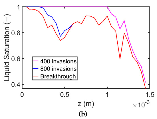 As can be seen, for the monomodal PN in Figure 12, widespread invasion patterns with a high number of invasions is not achieved. This is in contrast to the bimodal PN in Figure 13. Monte Carlo simulations yielded an average gas saturation of 26% for the monomodal network and 38% for the bimodal network. This shows that widening of the PSD (Figure 9) and the introduction of macro pores (Figure 11), both, result in a change of the invasion process. This change is more significant in the second situation. While capillary fingering with narrow single gas branches is rather favored by narrow PSDs, widening of the invasion front with higher gas saturations is obtained by larger PSDs, and larger porosities. However, it can also be shown that the widening of the front can also be achieved when the porosity is kept constant and only the PSD is adjusted (Figure 13). The monomodal and bimodal networks used in simulations have a constant porosity of 71%. Figure 12 and Figure 13 also show the saturation profiles of these simulations. They reveal the importance of the consideration of the PSD for characterization of the invasion process.
