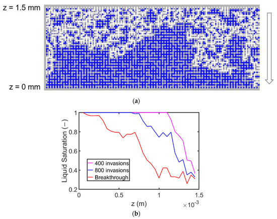 (a) Exemplary invasion patterns of the bimodal PN with porosity 71%. Liquid in blue, gas in white and solid in gray. Macro-pores are represented by thicker lines. The arrow indicates the direction of gas invasion. (b) Saturation profiles for different overall number of invaded throats and pores from one drainage simulation.