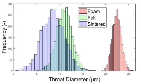 PSDs used for different PTL types with standard deviations: 1.0 µm for foam, 1.7 µm for felt and 2.5 µm for sintered.