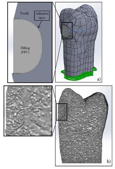 The virtual model of tooth 11 consisted of two parts, a GIC filling and a tooth of dentin (Figure 1a), while that of tooth 15 represented a system of three elements: tooth/30-µm adhesive layer/FPC filling (Figure 2a). The mesh, used in the simulations, is shown in Figure 1b and Figure 2b. Standard solid mesh of high quality and tetragonal elements with 0.1 mm average size was used. The total number of the finite elements in GIC simulation was 986,861 and the number of the total nodes was 1,377,670. These parameters for FPC simulation are 1,170,403 and 1,629,798, respectively. Concerning the boundary conditions, the teeth were fixed at the bottom of the root, as shown in Figure 1a and Figure 2a. In the numerical modeling, it was assumed that there was complete continuous contact between the tooth and the GIC filling and the three elements of the system in the case of FPC filling.