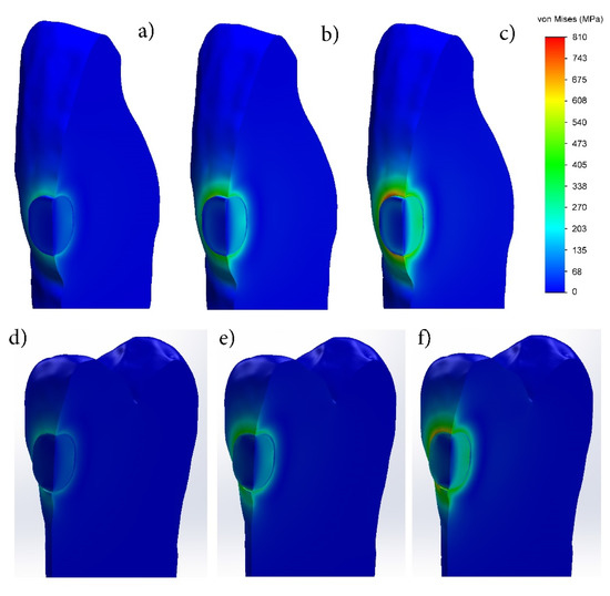 Distribution of equivalent Von Mises stresses during setting process of fillings made with: (a–c) glass-ionomer cement; (d–f) flowable photo-cured composite (FPC). (1% shrinkage—(a,d); 2% shrinkage—(b,e); 3% shrinkage—(c,f)).
