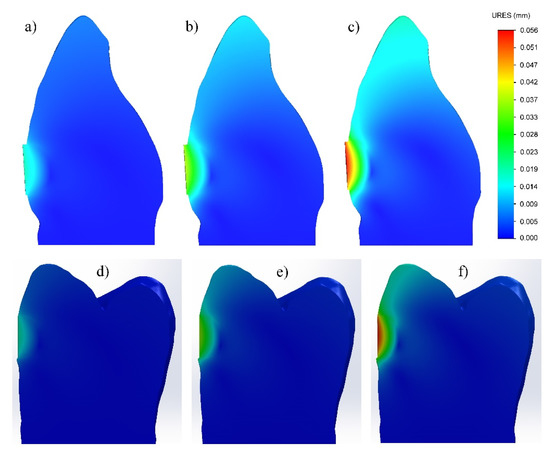 Displacement during setting process of fillings made with: (a–c) glass-ionomer cement; (d–f) flowable photo-cured composite. (1% shrinkage—(a,d); 2% shrinkage—(b,e); 3% shrinkage—(c,f)).