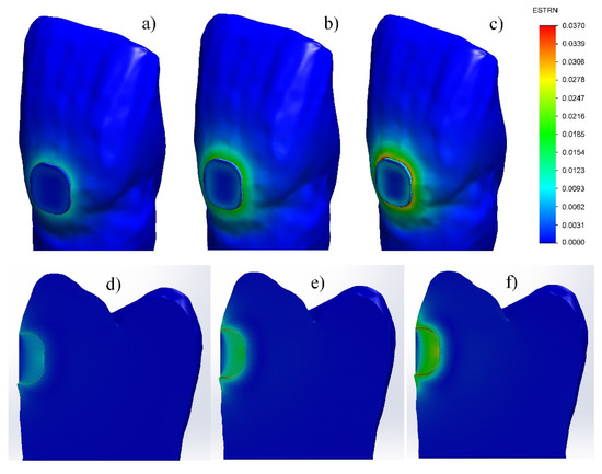 The investigation of the strain has shown that at the GIC filling, it is located along its periphery—in the dentin of the tooth and the GIC of the filling (Figure 5a–c) and increases with shrinkage increase. At maximum shrinkage, the strain is uneven along the periphery, with larger values at the rounded corners and with smaller values in the linear sectors. In the FPC filling (Figure 5d–f), the strain is highest in the adhesive layer located along the cavity/filling boundary and increases with increasing the shrinkage of the restorative material.