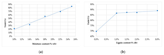 (a) Yield of pellet production versus moisture content of raw material, (b) yield production versus lignin content.