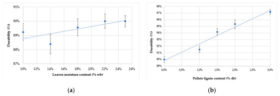 Durability of pellets. (a) Influence of the moisture content of leaves, (b) influence of the lignin content of pellets.