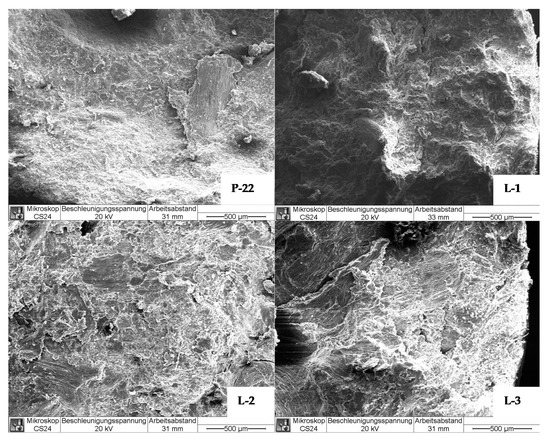 SEM images of pellets without lignin (P-22) and with different lignin contents (L-1, L-2, L-3).