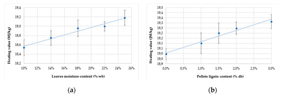 Net heating value (dry basis), (a) influence of the moisture content of leaves, (b) influence of the lignin content of pellets.