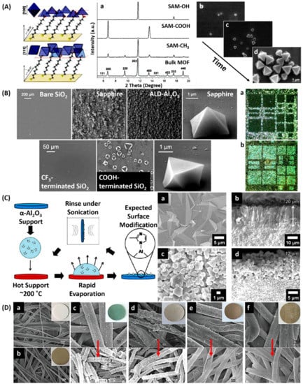 - Ameloot, R.; Gobechiya, E.; Uji-i, H.; Martens, J.A.; Hofkens, J.; Alaerts, L.; Sels, B.F.; De Vos, D.E. Direct patterning of oriented metal-organic framework crystals via control over crystallization kinetics in clear precursor solutions. Adv. Mater. 2010, 22, 2685–2688. [Google Scholar] [CrossRef]