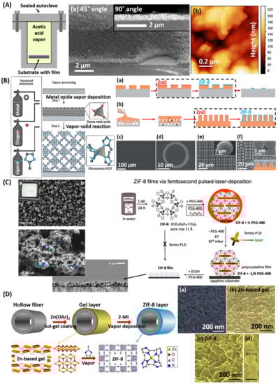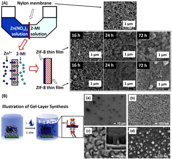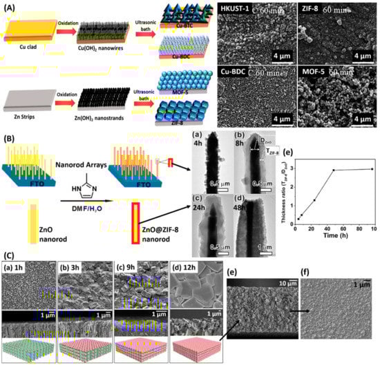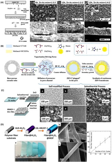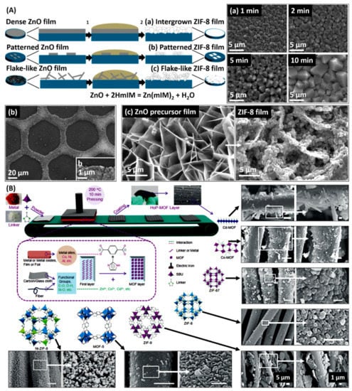- Khaletskaya, K.; Turner, S.; Tu, M.; Wannapaiboon, S.; Schneemann, A.; Meyer, R.; Ludwig, A.; Van Tendeloo, G.; Fischer, R.A. Self-directed localization of ZIF-8 thin film formation by conversion of ZnO nanolayers. Adv. Funct. Mater. 2014, 24, 4804–4811. [Google Scholar] [CrossRef]