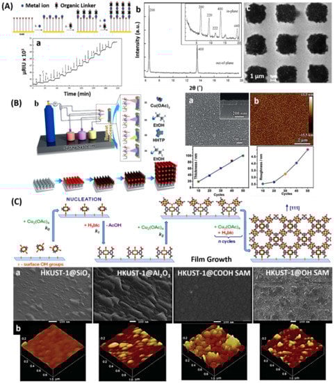 - Stavila, V.; Volponi, J.; Katzenmeyer, A.M.; Dixon, M.C.; Allendorf, M.D. Kinetics and mechanism of metal-organic framework thin film growth: Systematic investigation of HKUST-1 deposition on QCM electrodes. Chem. Sci. 2012, 3, 1531–1540. [Google Scholar] [CrossRef]