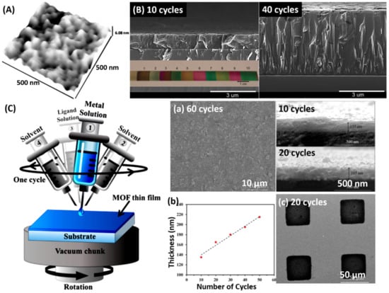 - Chernikova, V.; Shekhah, O.; Eddaoudi, M. Advanced fabrication method for the preparation of MOF thin films: Liquid-phase epitaxy approach meets spin coating method. ACS Appl. Mater. Interfaces 2016, 8, 20459–20464. [Google Scholar] [CrossRef]