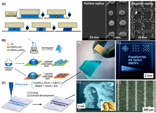- Zhuang, J.L.; Ar, D.; Yu, X.J.; Liu, J.X.; Terfort, A. Patterned deposition of metal-organic frameworks onto plastic, paper, and textile substrates by inkjet printing of a precursor solution. Adv. Mater. 2013, 25, 4631–4635. [Google Scholar] [CrossRef]
