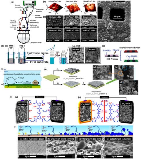 - Li, W.-J.; Tu, M.; Cao, R.; Fischer, R.A. Metal-organic framework thin films: Electrochemical fabrication techniques and corresponding applications & perspectives. J. Mater. Chem. A 2016, 4, 12356–12369. [Google Scholar]