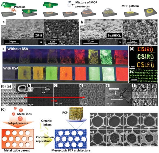 - Liang, K.; Carbonell, C.; Styles, M.J.; Ricco, R.; Cui, J.; Richardson, J.J.; Maspoch, D.; Caruso, F.; Falcaro, P. Biomimetic replication of microscopic metal-organic framework patterns using printed protein patterns. Adv. Mater. 2015, 27, 7293–7298. [Google Scholar] [CrossRef] [PubMed]