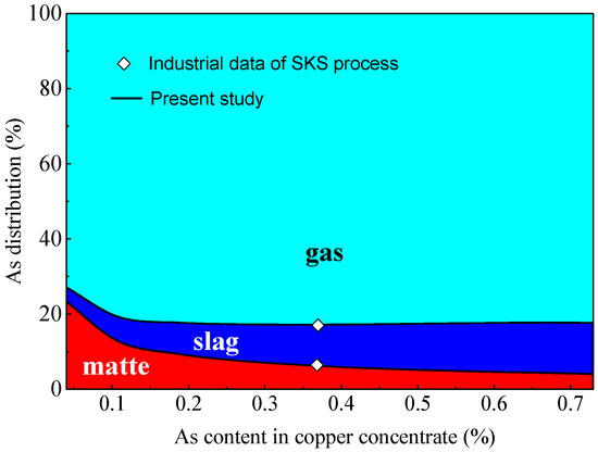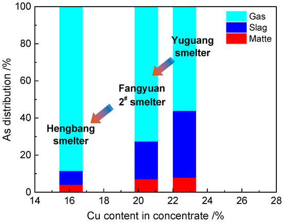 Therefore, a higher initial Cu content in the concentrate results in more arsenic in the matte phase, and the removal of arsenic from the smelting system to the gas phase is not very efficient.