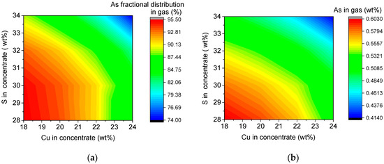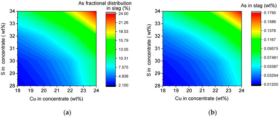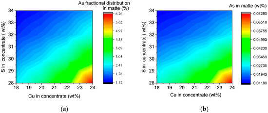 In the matte phase, the fractional distribution and mass fraction of arsenic in relation to the change in the initial content of Cu and S in concentrate are presented in Figure 7a,b. The variation trend in the matte phase is different from the gas and slag phases. As the S content in concentrate increases and Cu decreases, both the fractional distribution and mass fraction of arsenic decrease in the matte phase. With Cu 24% and S 28% in concentrate, about 6.3% arsenic reports to the matte phase, and mass fraction of arsenic in the matte phase is nearly 0.073%. However, with Cu 18% and S 34% in concentrate, about 1.1% of the arsenic enters the matte phase, and the mass fraction of arsenic in the matte phase is nearly 0.012%.