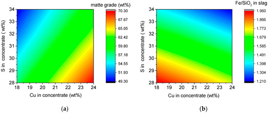 Slag type could affect the copper loss to slag and the capacity to remove impurities. Slag type Fe/SiO2 with the change in the initial content of Cu and S in concentrate is given in Figure 8b. As the Cu and S content in concentrate both increase, slag type Fe/SiO2 decreases. With Cu 18% and S 28%, Fe/SiO2 is about 1.9. However, as Cu and S content in concentrate increase to 24% and 34%, respectively, Fe/SiO2 is nearly 1.2. In the SKS process, Fe/SiO2 should be around 1.7.