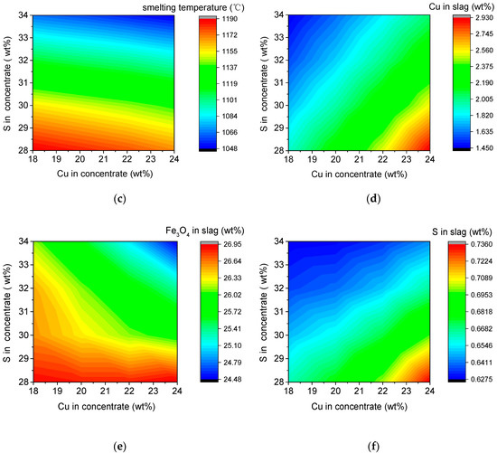 In slag, Fe3O4 can increase the viscosity of slag and further increase the copper loss to slag, thus Fe3O4 content in slag is a very important indicator. In Figure 8e, Fe3O4 content in slag with the change in the initial content of Cu and S in concentrate is given. As both the Cu and S content in concentrate increase, the Fe3O4 content in slag decreases. With Cu 18% and S 28%, the Fe3O4 content in slag is about 27%. However, when the Cu and S contents in concentrate increase to 24% and 34%, respectively, the Fe3O4 content in slag is nearly 24.5%.