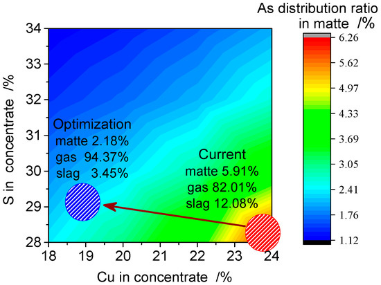 Through optimization, as shown in Figure 10, the concentrate composition was changed from its original proportions (Cu 24.4%, Fe 26.8%, S 28.7%, and other 20%) to optimized proportions (Cu 19%, Fe 32%, S 29%, and other 20%), and the distribution of arsenic among three phases was changed from the original (gas 82.01%, slag 12.08%, matte 5.91%) to optimized results (gas 94.37%, slag 3.45%, matte 2.18%). The mass fraction of arsenic in matte was reduced from 0.07% to 0.02%.