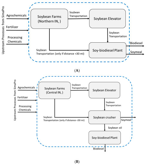 (A) Cradle-to-Gate System boundary for northern Indiana biodiesel production; (B) Cradle-to-Gate System boundary for central Indiana biodiesel production.
