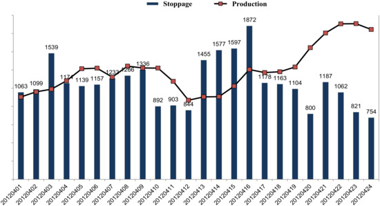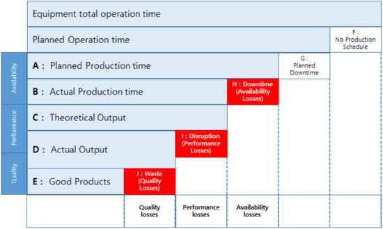 As shown in Figure 2, it is necessary to thoroughly identify the elements (i.e., time) which construct total equipment operation time in order to calculate the overall equipment effectiveness (OEE). The decomposition of the total equipment operation time thoroughly, allows derivation of three key indices, that is, the availability, performance, and quality, and then calculation of OEE by multiplying these three indices [21].