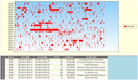 To analyze the availability loss of die attach process equipment, it is necessary to figure out how often faults occur in the process equipment, and how long it affects the process equipment. To do this, collection and classification of the faults and losses that occur in the die attach process equipment are required prior to analysis of the availability losses. In this research, we selected some of the die attach process equipment (ESEC 2100, SHINKAWA SPA 400, HITACHI DB 700, SECRON BD 502) that a semiconductor back-end manufacturing company “H” currently uses. For the selected equipment, equipment log data were collected by using the SECS messages they provide, that is, the starting and the finishing times of the losses as well as the types of losses. Utilizing the collected data, we developed an analysis system that shows what kinds of equipment faults resulting in losses occur how often and how long it continues as shown in Figure 3. Through this developed analysis system, a frequency analysis can be carried out that occurred in die attach process equipment, and also help figure out the influence of losses on the equipment (i.e., loss duration time). In Figure 3, the y-axis and x-axis represent the equipment ID number and loss duration time, respectively. The “RES_ID”, “EFFECT”, “ALARM_ID”, and “ALARM_MSG” in Figure 3 represent the equipment ID number, loss duration time, alarm ID, and alarm description, respectively. For example, we can see that equipment “BD409” is the equipment that caused long-term loss and also alarms have occurred several times in a short time at equipment “BD410”. Accordingly, this alarm distribution chart allows equipment engineers to grasp and compare the loss and alarm distributions of equipment and also to predict process equipment that need preventive maintenance in the future.