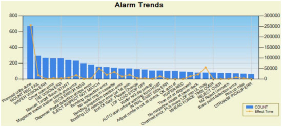Based on the result of the loss frequency and loss duration time analysis, we developed a system that can carry out an additional fault analysis for the equipment that was long lasted due to losses as shown in Figure 4. In Figure 4, the y-axis on the left side of the graph, the y-axis on the right side of the graph, and x-axis represent the frequency of occurred losses, the amount of time to fix the corresponding cause of loss, and the types of losses, respectively. Figure 4 shows the analysis results of the losses that occur in the die attach process equipment according to loss categories. This analysis result includes the types of losses that the most frequently occurs, its frequency, and impact of the individual loss on the die attach process equipment. For example, the number of occurrences of loss type “EJECT INSPECT NOT MATCH” is small (almost less than 200), but the time to resolve this loss problem is moderately high.