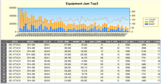 Finally, we developed another analysis system which shows fault types by die attach process equipment. With this system, for the die attach process equipment that losses frequently occur among all the die attach process equipment, the number of losses (named as “JAM_COUNT” in the table), the stoppage time of equipment (named as “STOP_TIME” in the table), and the required maintenance time of the corresponding (named as “MAINT_TIME” in the table) were analyzed as shown in Figure 5. For example, it is shown that there are 41 losses, and the stoppage time and maintenance time of the equipment “BD011” of the model “SPA-300” are 477,893 and 94,203, respectively.