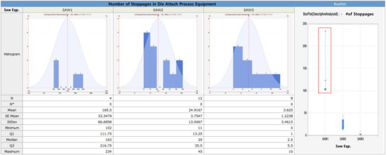 Then, in this research, we developed a system for executing a variety of descriptive statistical analysis based on data shown in Table 6. Figure 6 shows the results of the descriptive statistical analysis of wafer sawing process equipment which might affect equipment faults that occurred in die attach process equipment. As shown in Figure 6, among the three wafer sawing equipment, it is found that the number of stoppage of the first wafer sawing equipment is the highest and thus the lots which passed through the first wafer sawing equipment (wafer sawing equipment No. 1) cause the most losses.
