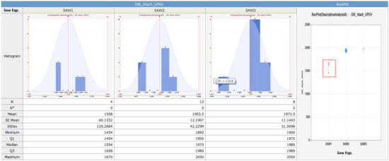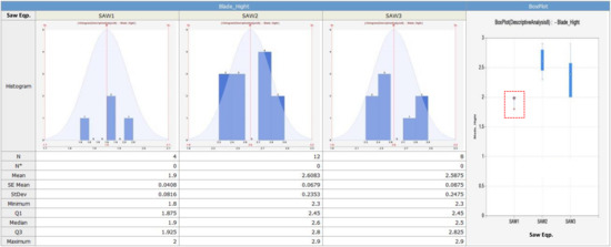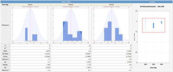 Based on the descriptive statistical analysis results, we additionally developed a system to analyze the effect of the blade height and the blade width, which are two main control parameters of the wafer sawing process equipment, and how these two control parameters influence on faults in die attach process equipment. That is, through this system, it is possible to analyze whether there is a difference in the blade heights and the blade widths by wafer sawing process equipment. Again, it is proved that the lots processed in the first wafer sawing process equipment caused more losses in the die attach equipment compared to the lots processed in the second and the third wafer sawing process equipment. Then, after analyzing whether there is a difference between the blade width of the first wafer sawing process equipment and that of the other two wafer sawing process equipment, we found that there is no difference in the blade width as shown in Figure 7. Thus, we can conclude that that the blade width has no effect on the faults (finally leading to losses) in die attach process equipment.