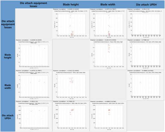 Additionally, we developed correlation analysis system for the four factors (equipment parameters) that affect the productivity, which are (i) the number of losses (due to equipment fault, i.e., unexpected stoppage) that occurred in die attach process equipment, (ii) the blade width of the wafer sawing process equipment, (iii) the blade height of the wafer sawing process equipment, and (iv) UPEHs of the die attach process equipment as shown in Figure 10. Through this system, the correlation coefficients of the previously mentioned four factors (parameters), die attach process equipment, and wafer sawing process equipment can be obtained as shown in Table 7.