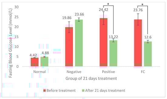 The fasting blood glucose (FBG) level of normal rats was in a range between 4.4 ± 0.10 and 4.9 ± 0.20 mmol/L throughout 21 days of experiment, as shown in Figure 1. While the induction of STZ increased, the FBG level of normal rats was from 4.9 ± 0.20 mmol/L to a diabetic stage as resembled by the negative control of 23.7 ± 0.89 mmol/L. Both treatments of 400 mg/kg FC and 300 mg/kg metformin significantly decreased (p < 0.05) the FBG level of diabetic rats compared to the negative control (Figure 1). Diabetic rats administered with FC extract showed the reduction of the FBG level from 23.6 ± 2.87 to 12.6 ± 0.66 mmol/L, and it was almost similar to metformin that reduced FBG levels from 24.4 ± 3.27 to 13.22 ± 0.81 mmol/L.